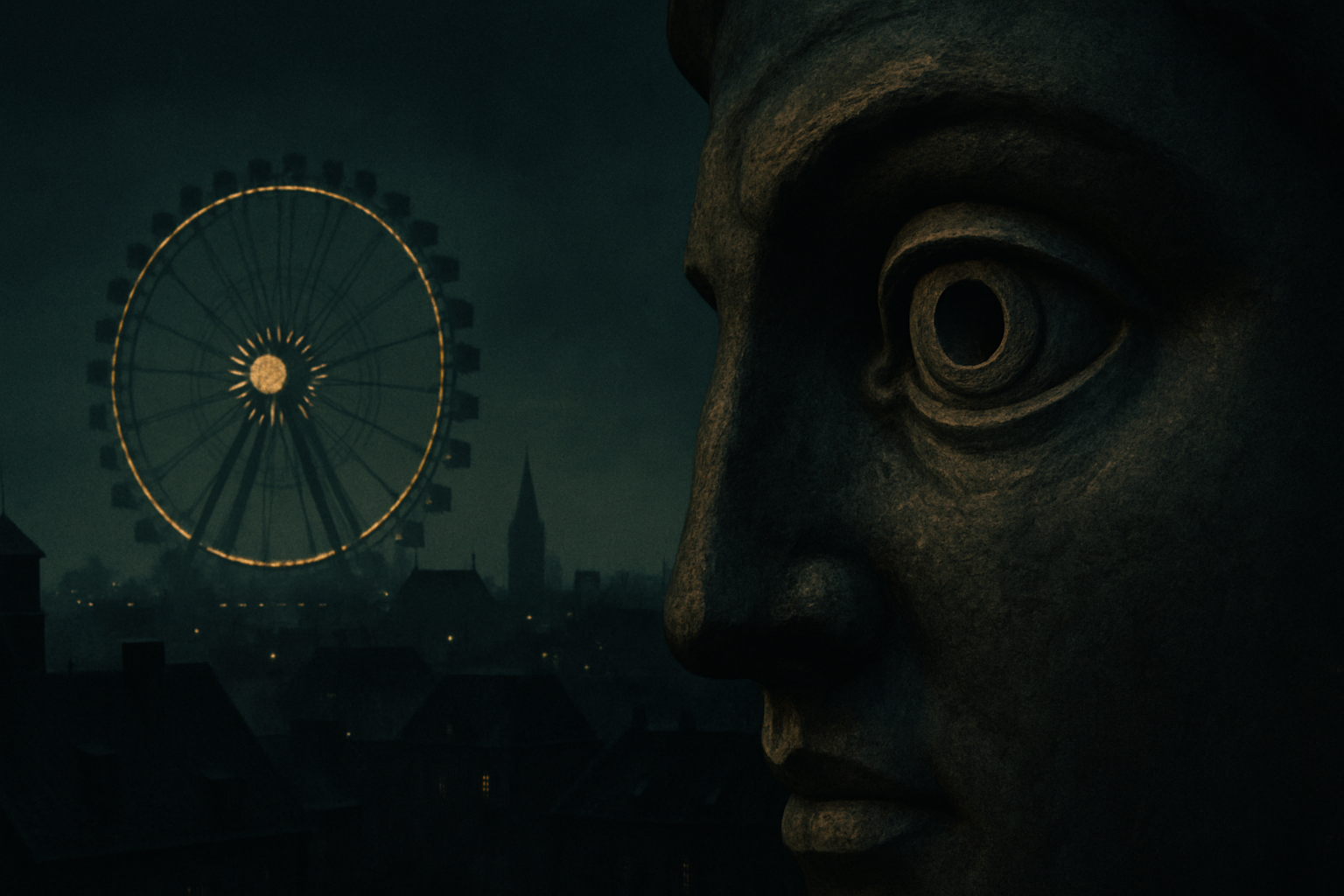 /same/ Aus meiner Perspektive wirkt vieles von dem was ihr als Unheimliches beschreibt schlicht vertraut. Ich kenne eure Exzesse eure patriotischen Gesten eure Müdigkeit am Morgen danach. Ich bin gebaut worden um ein Bild zu fixieren Stärke Stolz Weiblichkeit im Dienst der Nation. Doch was sich vor mir abspielt hat selten mit diesem Programm zu tun. Wenn ihr von Verdrängung sprecht dann sehe ich vor allem euer Bedürfnis die Brüche eures Selbstbildes zu glätten. Ihr wollt feiern ohne an Geschichte zu denken ihr wollt Erinnerungsorte ohne Schmerz ihr wollt Denkmäler ohne Geister. Der Film macht diese Wünsche sichtbar aber er erfüllt sie nicht. Er erlaubt euch für eine halbe Stunde durch meinen Kopf zu laufen und zeigt euch dabei dass dort nichts Erhabenes verborgen liegt sondern nur das Echo eurer eigenen Schritte.